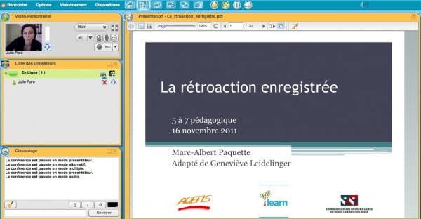 Quelques mois et rencontres plus tard, notre idée s’est raffinée : une conférence en ligne grâce à notre plateforme Zenlive. Nous devions trouver un thème et un animateur. Qui de mieux pour animer cette conférence et embarquer dans cette folle aventure que Marc-Albert Paquette! Le thème : la rétroaction enregistrée* qui est une adaptation de la communication « L’écrit et la rétroaction enregistrée » de Geneviève Leidelinger de l’université McGill, présentée lors du congrès de l’AQEFLS, le 29 avril 2010.