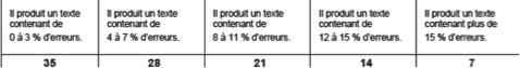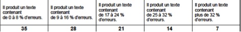 En regard de ces grilles, je dois compter le nombre total de mots du texte et ensuite le nombre de fautes afin de trouver le pourcentage d’erreurs dans chacune des productions. Alors, si un élève du programme enrichi a 36 erreurs sur 400 mots écrits, il a 9 % d’erreurs. Donc, cet élève a 21 points sur 35.