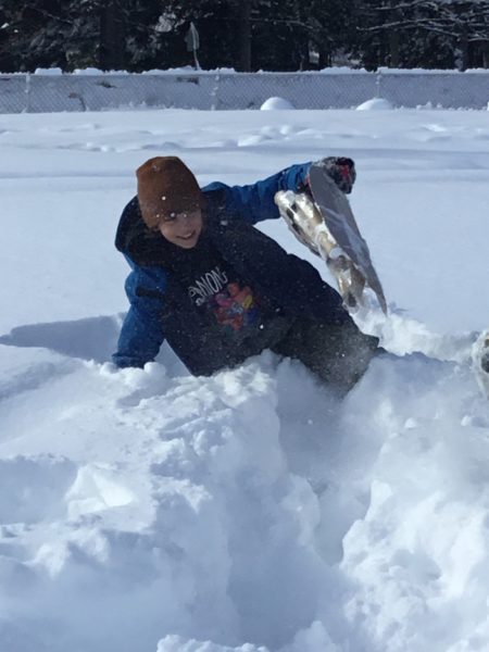 Toolkits full! Next, work. Students went about measuring, brainstorming, designing, creating prototypes, testing, and improving their personal snowshoes. Then it was test day. Everyone went outside again to test out each of the student designs. All snowshoes were unique and only a few met the performance challenge to travel 20 meters and have sufficient flotation! Prompting more questions!