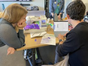 I explored Turtle Stitch and our embroidery machine alongside one of the participants. Having only started experimenting with the Turtle Stitch website and machine the day before, I still had a lot to learn. Our exploration of these two technologies included many moments of “I don’t know” and “let’s try it and see”. Turtle Stitch is a fantastic way to connect technology, math, and coding, with art; using the drag-and-drop block coding of Turtle Stitch, you are able to create intricate embroidered designs with the machine. Midway through the morning, with an embroidery project completed, I was drawn to the other side of the room where a group was assembling to try their hands at crochet.