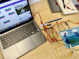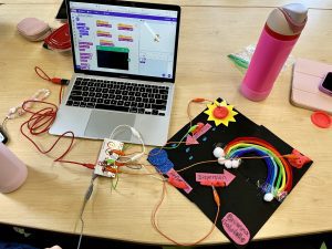 Our second activity was a little more high tech, as we used the microcontroller, Makey Makey to animate a science model they had previously created in class on a variety of concepts like the life of a worm, and water cycle. We showed them how to hookup a Makey Makey that would take over the keyboard with conductive materials, like play dough, copper tape and pencils, plus we added Scratch so they could record their voices explaining what their model was all about. It was great fun with lots of fun information presented when we did our museum walk.