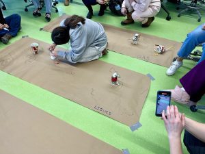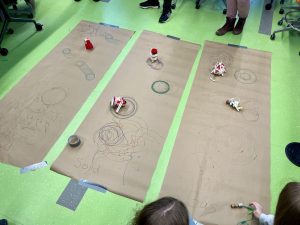 The Prompt: Create an artbot that can draw on its’ own (hands-free) that represented in its markings one of the states of matter. The idea being that gas would leave a random, spacious marking on paper, liquid more linear but still has space between markings and solid would be represented in a solid line. The students had limited materials (a cup, motor, battery, markers, cup, two wires and a cork), and were on limited time… 25 minutes to complete.